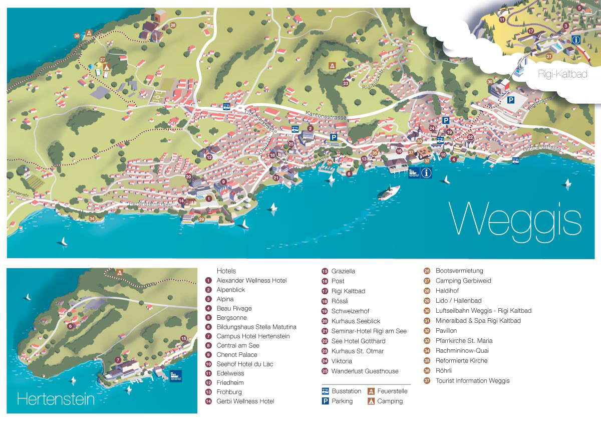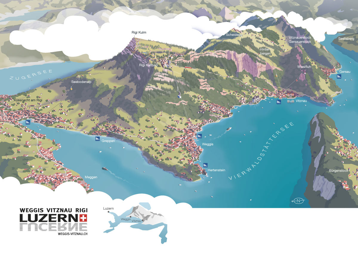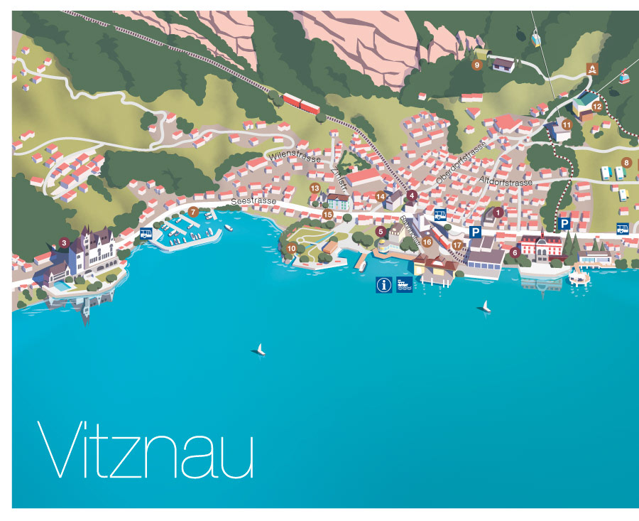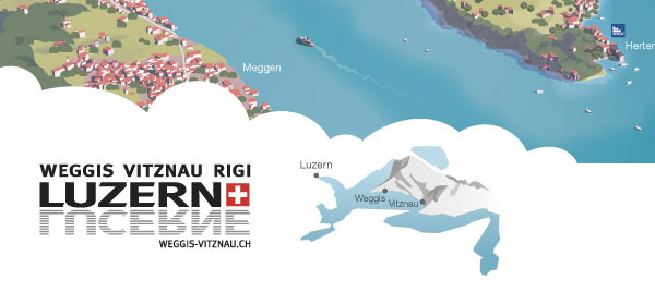 Panoramic maps for Luzern Tourismus. Printed versions are given to visitors at the tourist offices. Detailed maps for Weggis and Vitznau repspectively show every hotel, transport info and a few sight seeing tips.