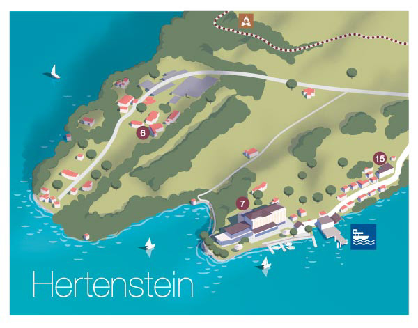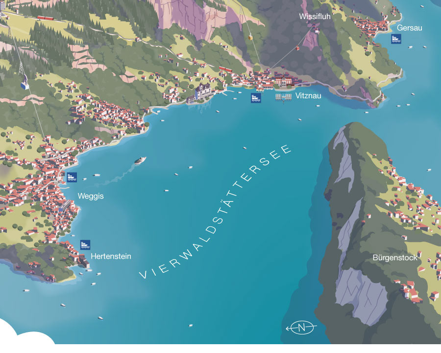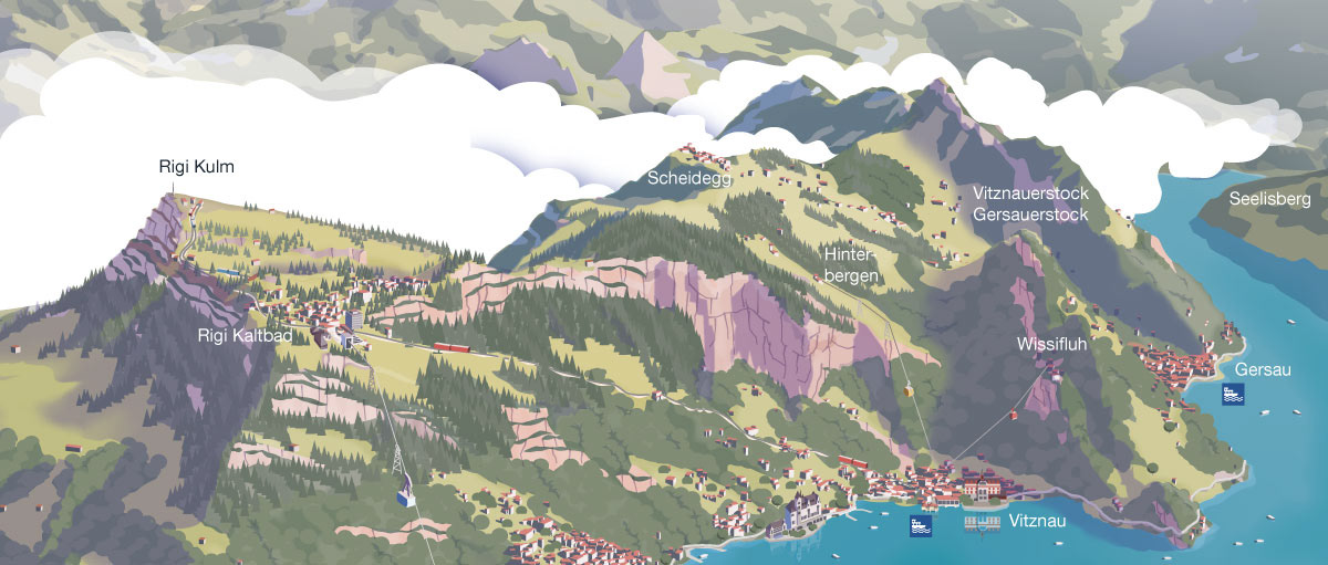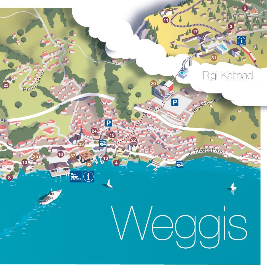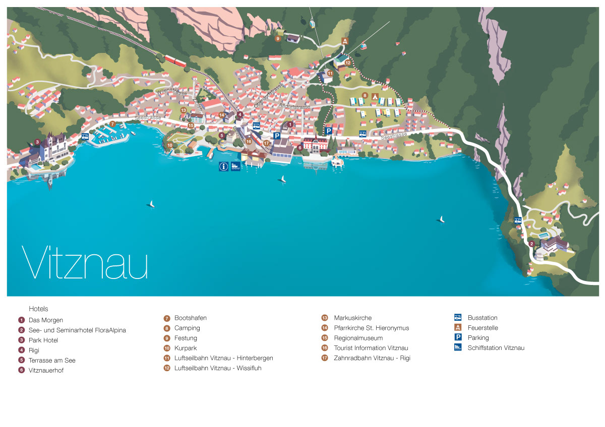 Panoramic maps for Luzern Tourismus. Printed versions are given to visitors at the tourist offices. Detailed maps for Weggis and Vitznau repspectively show every hotel, transport info and a few sight seeing tips.